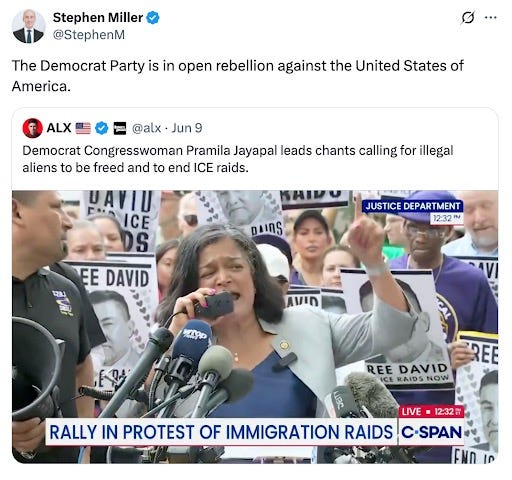 They wish to portray citizens protesting unAmerican activity as people who are trying to “rebel.” And remember that word. If he can convince enough people that that’s what’s happening, as Steven Miller is already trying to do, then that will pave the way for him to invoke the Insurrection Act and declare Martial Law.